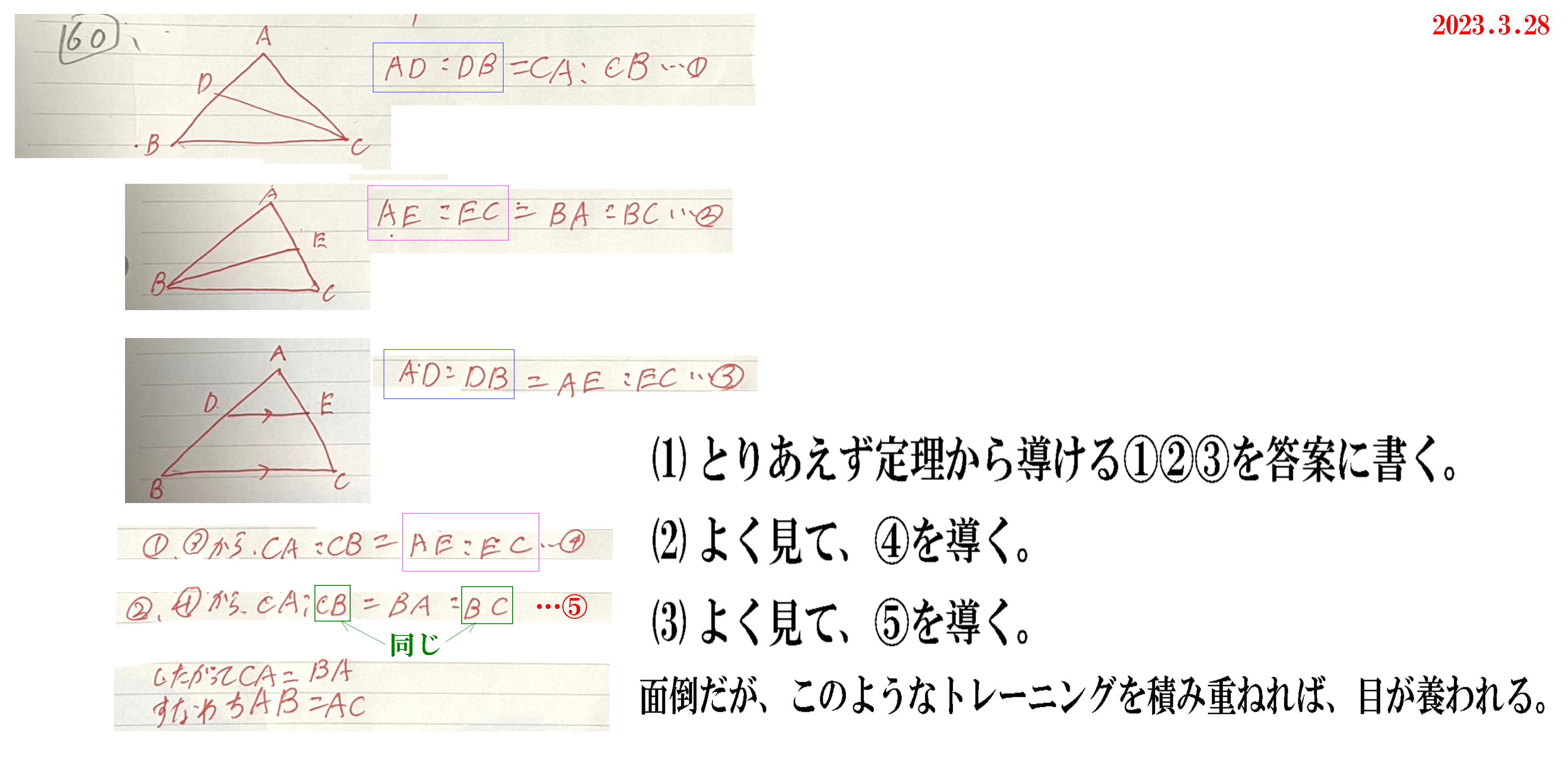 1-140 データ論 中央値 ![]() A-008 場合の数 ~でない ![]() A-016 場合の数 数字の順番 ![]() A-035 確率 組み合わせと確率 ![]() A-036 確率 確率の加法定理(順列) ![]() A-059 図形の性質 三角形の核の二等分線と比 ![]() ◆◆◆ワンポイントアドバイス◆◆◆ ⊿ABCは、Aを頂点に描くのが基本。 外分は「B」発信→BD:DC=BA:AC 内分も「B」発信→BD:DC=BA:AC A-060 図形の性質 角の二等分線と比の利用 ![]() ◆◆◆ワンポイントアドバイス◆◆◆ (1)とりあえず定理から導ける①②③を答案に書く。 (2)よく見て、④を導く。 (3)よく見て、⑤を導く。 面倒だが、このようなトレーニングを積み重ねれば、目が養われる。 |